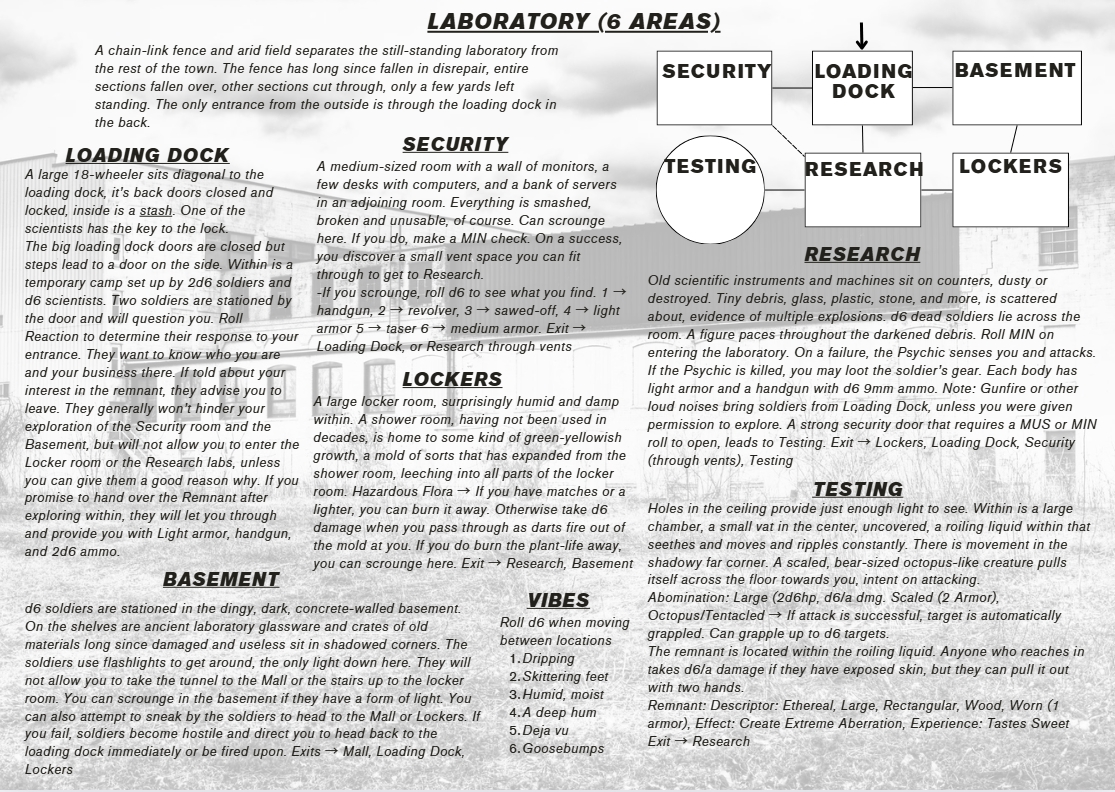 Note: I started with a core idea, "Laboratory with soldiers/scientists", but used the tables and procedures in Niv Lova to flesh out the locations, areas and the rest. I hope this shows you that you can do the same with just a few dice rolls and imagination. Thanks