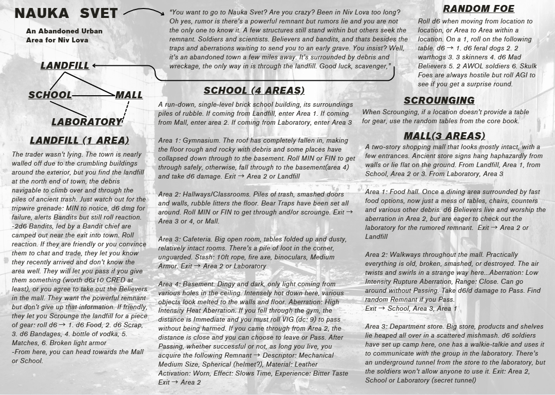 -Nauka Svet is a fully fleshed out abandoned urban area for Niv Lova. It's written from the perspective of playing it solo (using "you" instead of "players") but can easily be used with a group as well.
